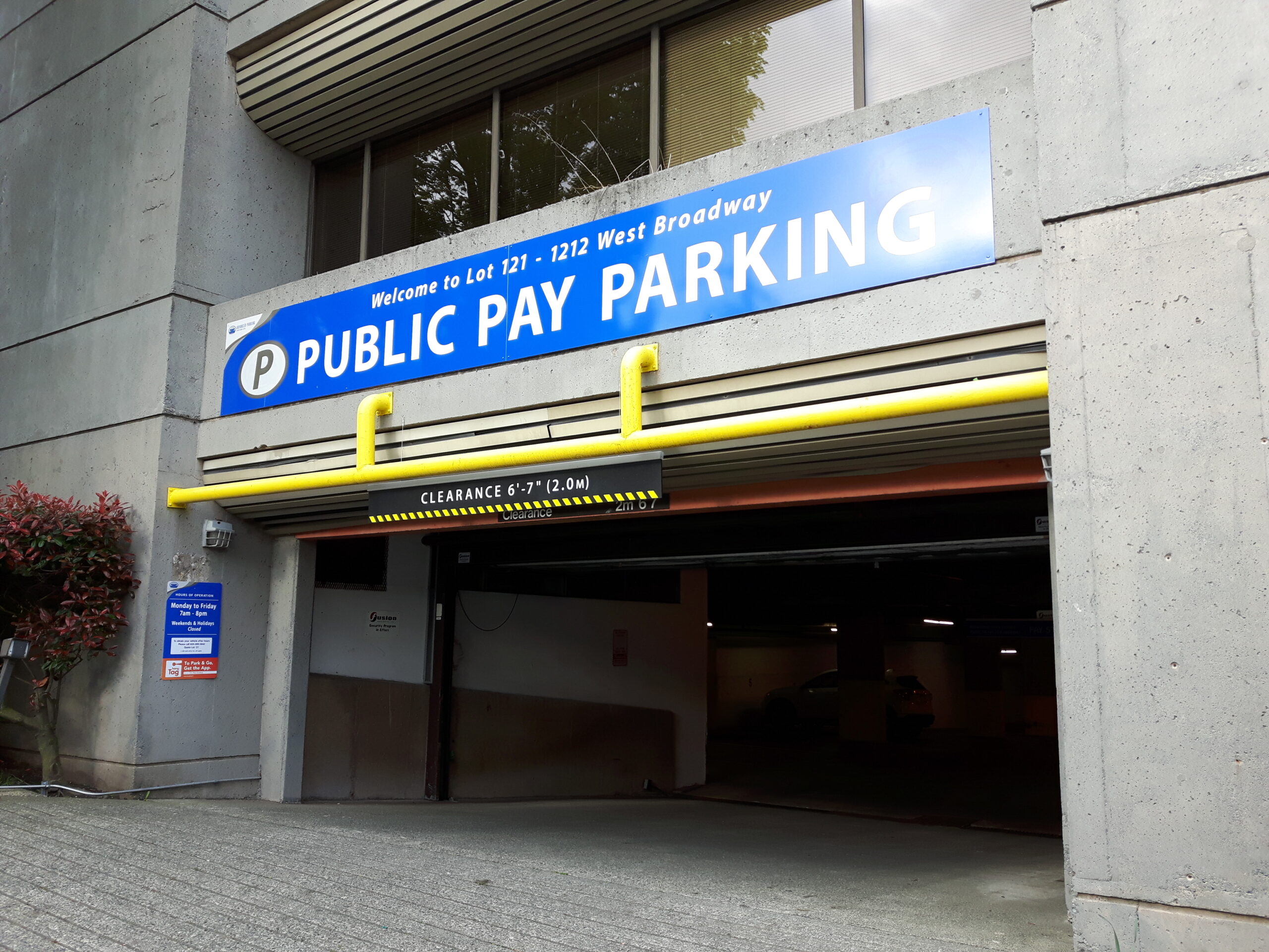 This parkade is located on West Broadway, between Alder St. and Birch St., next to the Heart & Stroke Foundation and across the street from Royal Seoul House.