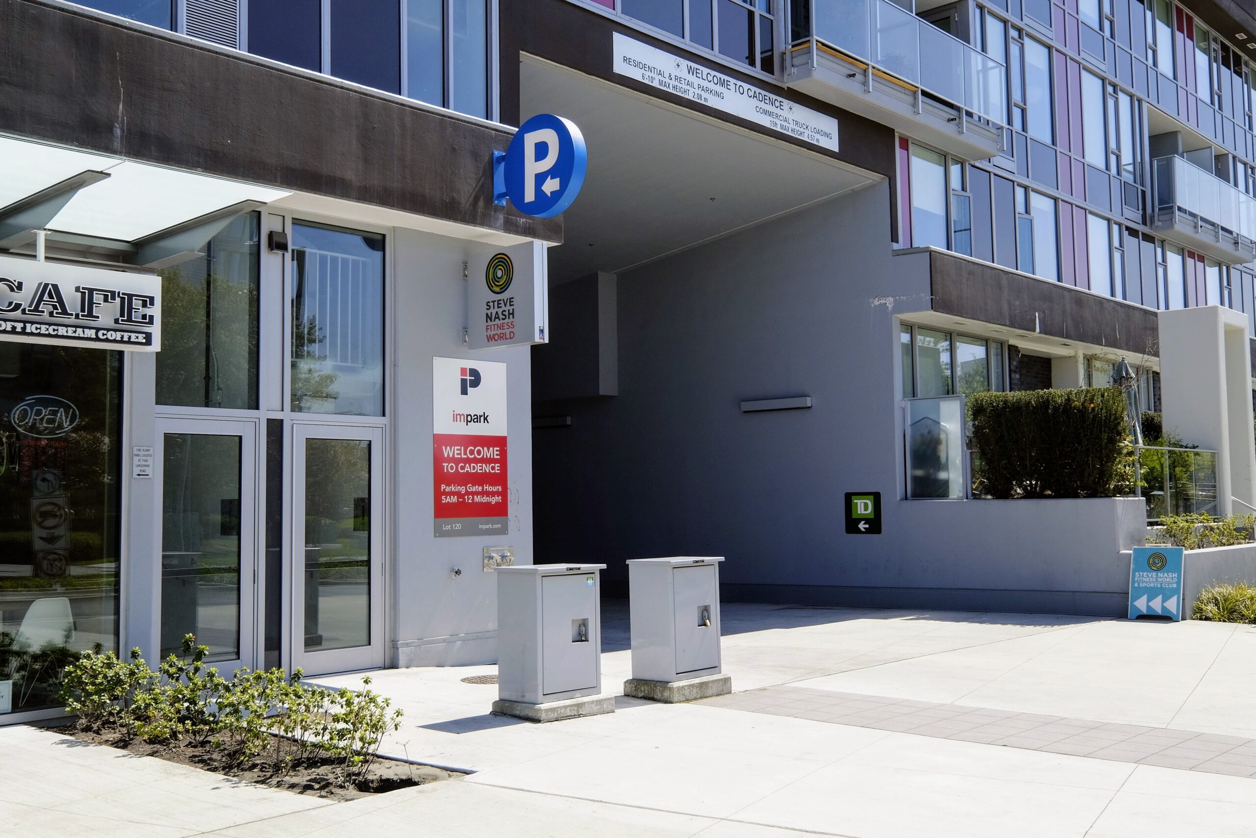Cadence is a new development consisting of retail stores, restaurants, bank, fitness gym, medical offices and residential units. The parking entrance is off Hollybridge Way and visitors to Cadence can park on the one underground level consisting of about 200 stalls.